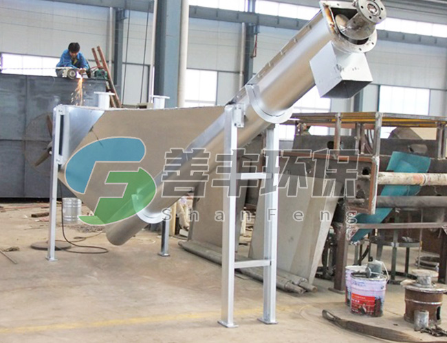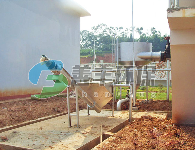 螺旋式砂水分離器由無軸螺旋、襯板、U 型槽、箱體、導流板、出水堰和驅動裝置組成。砂水混合物從分離器一端頂部輸入水箱,混合液中重度較大的,如砂粒等將沉積于槽型底部,在螺旋的推動下,砂粒沿斜置的槽底提出升,離開液面后繼續推移一段距離,在砂粒充分脫水后經排砂口卸至盛砂桶,而與砂水分離后的水從溢流口排出并送往廠內進水池。