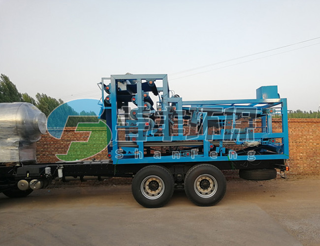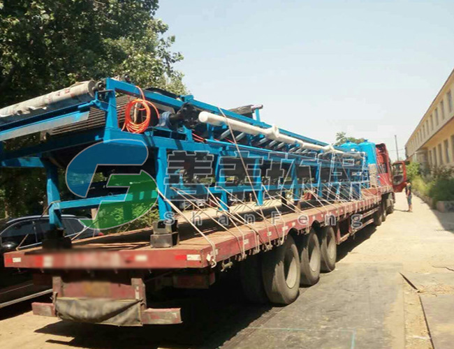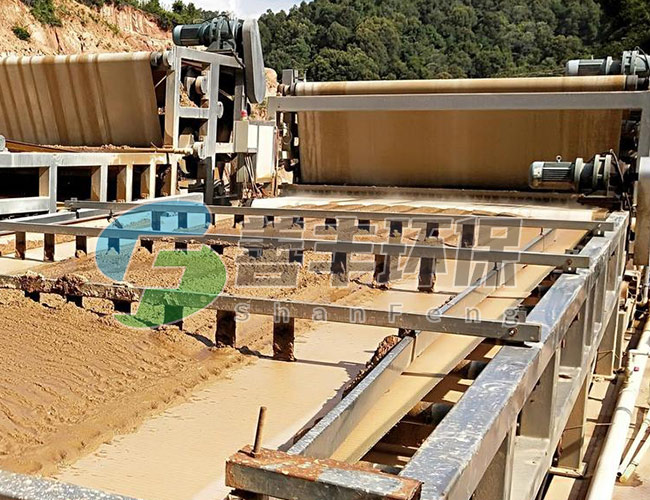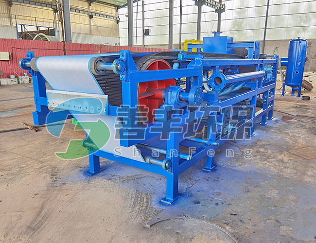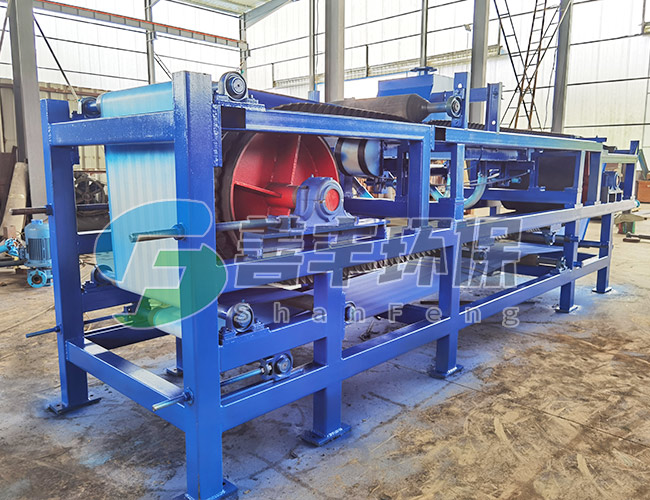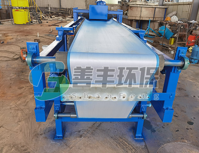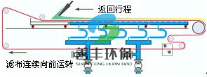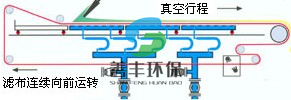料漿由進(jìn)料裝置均布在向前移動(dòng)的濾布上,在真空泵的抽濾作用下,濾液穿過(guò)過(guò)濾布和膠帶過(guò)濾孔進(jìn)入真空箱,再?gòu)恼婵障湎虏康倪B接管道進(jìn)入濾液罐,固相截留在濾布上形成濾餅。由于重力和真空抽力方向一致,沉降時(shí)較大顆粒沉在濾餅之下,小顆粒沉在濾餅之上,形成結(jié)構(gòu)合理的助濾層,其阻力小。過(guò)濾速度高。所形成的濾餅隨膠帶而移動(dòng)被多次洗滌,脫水,然后在濾布轉(zhuǎn)向處脫落。其后,濾布和膠帶經(jīng)過(guò)驅(qū)動(dòng)轘分開(kāi),分別用高壓水清洗再生,濾布經(jīng)過(guò)糾偏裝置調(diào)整后,重新回到進(jìn)料端開(kāi)始新的作業(yè)循環(huán)。