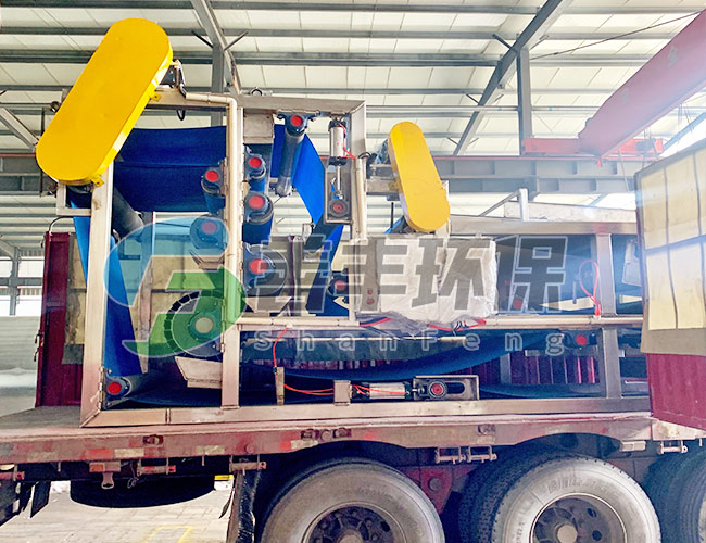 污泥經投加凝聚劑后進行充分混合反應之后流入濃縮段的進料分配器,將污泥均勻分布到傾斜式的濃縮段上,并在泥耙的雙向導疏和重力作用下,污泥隨著濾帶的轉動,迅速脫去污泥的游離水。重力脫水后濃縮污泥經反轉機構將污泥輸送至帶式壓濾機的重力脫水段進一步脫水。然后喂入“S”形壓榨段,在“S”形壓榨段中,污泥被夾在上,下兩層濾布中間,經若干個不同口徑輥筒反復壓榨,使污泥再一次脫水,醉后通過刮將泥餅刮落,而上下網在運行過程中不斷地被自動清洗。