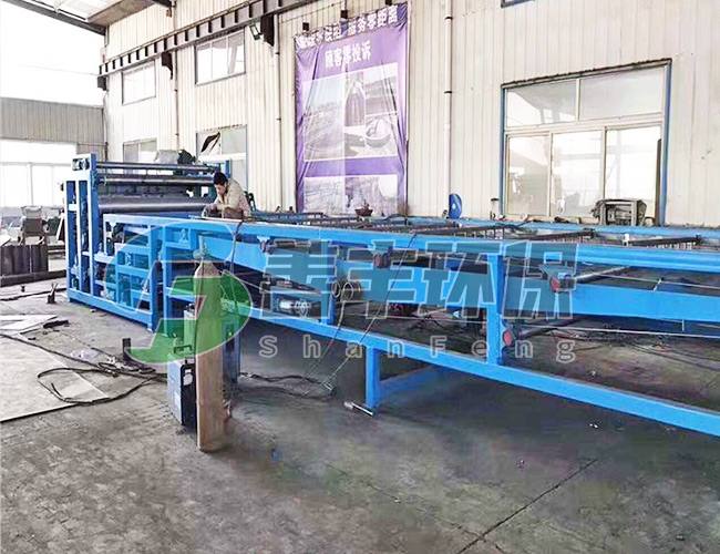 污泥經(jīng)投加凝聚劑后進(jìn)行充分混合反應(yīng)之后流入濃縮段的進(jìn)料分配器,將污泥均勻分布到傾斜式的濃縮段上,并在泥耙的雙向?qū)韬椭亓ψ饔孟拢勰嚯S著濾帶的轉(zhuǎn)動,迅速脫去污泥的游離水。重力脫水后濃縮污泥經(jīng)反轉(zhuǎn)機(jī)構(gòu)將污泥輸送至帶式壓濾機(jī)的重力脫水段進(jìn)一步脫水。然后喂入“S”形壓榨段,在“S”形壓榨段中,污泥被夾在上,下兩層濾布中間,經(jīng)若干個不同口徑輥筒反復(fù)壓榨,使污泥再一次脫水,醉后通過刮將泥餅刮落,而上下網(wǎng)在運(yùn)行過程中不斷地被自動清洗。